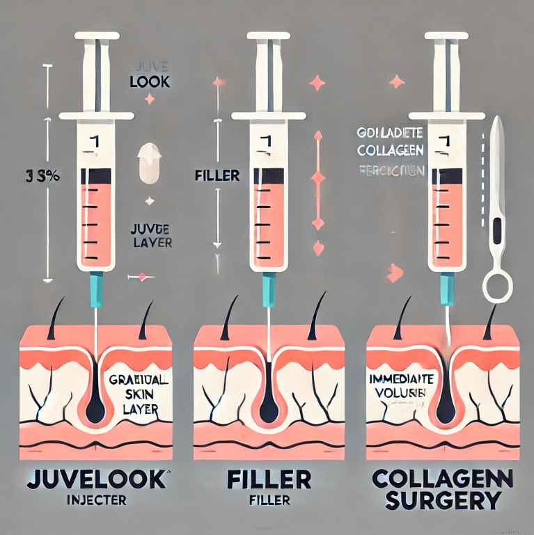 콜라겐 수술은 피부 속 자연적인 재생을 유도하는 방식으로, 인위적인 볼륨 형성을 목표로 하지 않습니다. 반면, 쥬베룩은 콜라겐 생성을 자극하는 주사제로, 절개가 필요하지 않으며 시술 후 회복 기간이 짧습니다.